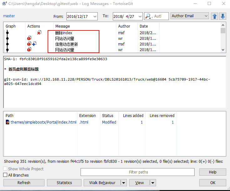 注:此处的 -r 282506:HEAD 代表从svn的282506版本到最新版本的提交记录,避免从第一个版本拉取数据量过大,操作耗时高。svnurl是你的svn项目地址。如果需要拉取所有记录,可去除 -r 282506:HEAD